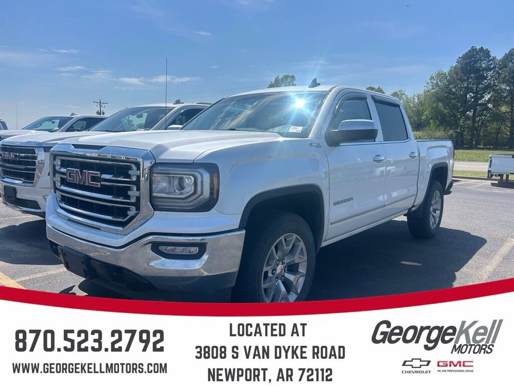 Recent Arrival! George Kell Motors is proud to present you with another True Market Priced Pre-Owned Vehicle. This 2018 GMC Sierra 1500 SLT is loaded with the following Factory Options:Off-Road Suspension Package (Hill Descent Control), Preferred Equipment Group 4SA (110-Volt AC Power Outlet, 150 Amp Alternator, 1st & 2nd Row Color-Keyed Carpeted Floor Mats, 2-Speed Active Electronic AutoTrac Transfer Case, 4.2 Diagonal Color Display Driver Info Center, Auto-Dimming Inside Rear-View Mirror, Auxiliary External Transmission Oil Cooler, Chrome Bodyside Moldings, Chrome Door Handles, Chrome Mirror Caps, Color-Keyed Carpeting, Deep-Tinted Glass, Driver & Front Passenger Illuminated Vanity Mirrors, Dual-Zone Automatic Climate Control, Electric Rear-Window Defogger, EZ Lift & Lower Tailgate, Front Frame-Mounted Black Recovery Hooks, GMC 4G LTE, GMC Connected Access, Heavy-Duty Rear Locking Differential, Leather Wrapped Steering Wheel w/Cruise Controls, LED Cargo Box Lighting, LED Tailamps w/Signature, Manual Tilt/Telescoping Steering Column, OnStar & GMC Connected Services Capable, Power Adjustable Pedals, Power Folding & Adjustable Heated Outside Mirrors, Power Windows w/Driver Express Up & Down, Rear 60/40 Folding Bench Seat (Folds Up), Rear Wheelhouse Liners, Remote Keyless Entry, Remote Locking Tailgate, Remote Vehicle Starter System, Single Slot CD/MP3 Player, Steering Wheel Audio Controls, Theft Deterrent System (Unauthorized Entry), Thin Profile LED Fog Lamps, and Universal Home Remote), SLT Premium Package (20 x 9 Polished Aluminum Wheels, 6 Rectangular Chromed Tubular Assist Steps, and Bose Speaker System), Trailering Equipment, 6-Speed Automatic Electronic with Overdrive, 4WD, Cocoa/Dune Leather, 10-Way Power Driver's Seat Adjuster, 4-Wheel Disc Brakes, 40/20/40 Front Split Bench Seat, 6 Speakers, 6-Speaker Audio System, ABS brakes, Adjustable pedals, Air Conditioning, All-Weather Floor Liner (LPO), Alloy wheels, AM/FM radio: SiriusXM, Auto-dimming door mirrors, Auto-dimming Rear-View mirror, Automatic temperature control, Bodyside moldings, Brake assist, Bumpers: chrome, CD player, Compass, Delay-off headlights, Driver door bin, Driver vanity mirror, Dual front impact airbags, Dual front side impact airbags, Electronic Stability Control, Exterior Parking Camera Rear, Floor Mounted Console, Front anti-roll bar, Front Center Armrest w/Storage, Front dual zone A/C, Front fog lights, Front Full Feature Power Reclining Bucket Seats, Front License Plate Kit, Front reading lights, Front wheel independent suspension, Fully automatic headlights, Garage door transmitter, HD Radio, Heated & Ventilated Front Bucket Seats, Heated door mirrors, Heated Driver & Front Passenger Seats, Heated front seats, Heavy Duty Suspension, High-Intensity Discharge Headlights, Illuminated entry, Leather Appointed Seat Trim, Low tire pressure warning, Memory seat, Occupant sensing airbag, Outside temperature display, Overhead airbag, Overhead console, Panic alarm, Passenger door bin, Passenger vanity mirror, Polished Exhaust Tip, Power door mirrors, Power driver seat, Power passenger seat, Power steering, Power windows, Premium audio system: GMC Infotainment System, Radio data system, Radio: AM/FM/GMC Infotainment & Navigation, Radio: AM/FM/GMC Infotainment System, Rear reading lights, Rear seat center armrest, Rear step bumper, Rear window defroster, Remote keyless entry, Security system, SiriusXM Satellite Radio, Speed control, Speed-sensing steering, Split folding rear seat, Spray-On Pickup Box Bed Liner w/GMC Logo, Steering wheel mounted audio controls, Tachometer, Telescoping steering wheel, Tilt steering wheel, Traction control, Trip computer, Turn signal indicator mirrors, Variably intermittent wipers, Voltmeter, Wheels: 18 x 8.5 Polished Aluminum, and Wireless Charging.Free Service Pickup and Delivery available within 75 miles.CARFAX One-Owner.White Frost Tricoat 2018 GMC Sierra 1500 SLT 4D Crew Cab 4WD EcoTec3 5.3L V8